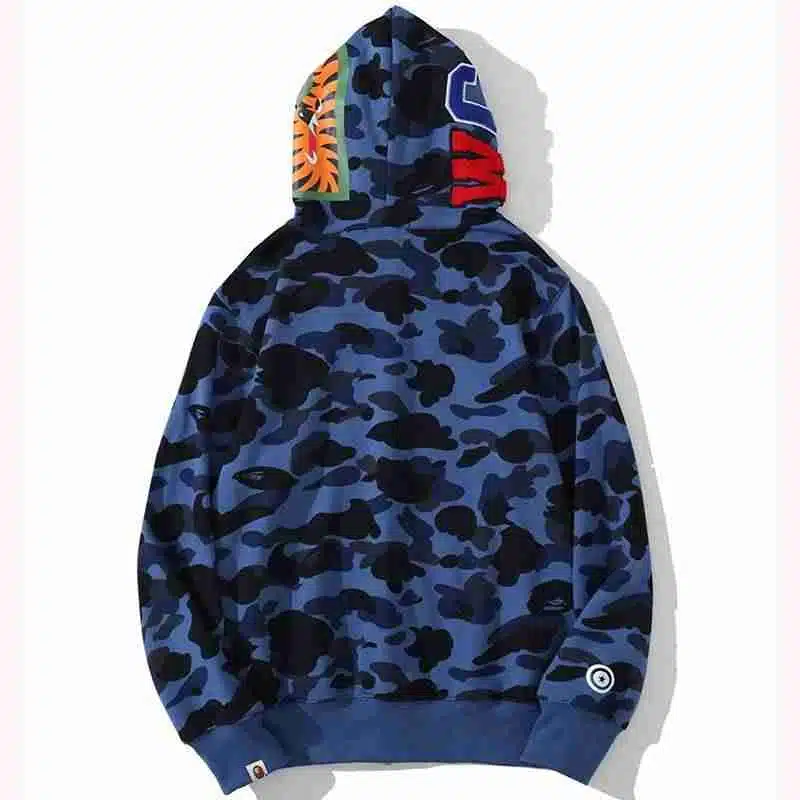 The BAPE Blue Camo Hoodie is constructed from cotton material to provide comfort and durability during regular use. It features a pullover design with an attached hood and ribbed cuffs and hem to help maintain shape. The blue camouflage pattern adds visual detail while remaining suitable for everyday styling. Designed for casual and streetwear wear, this hoodie works well for daily outfits and relaxed use.